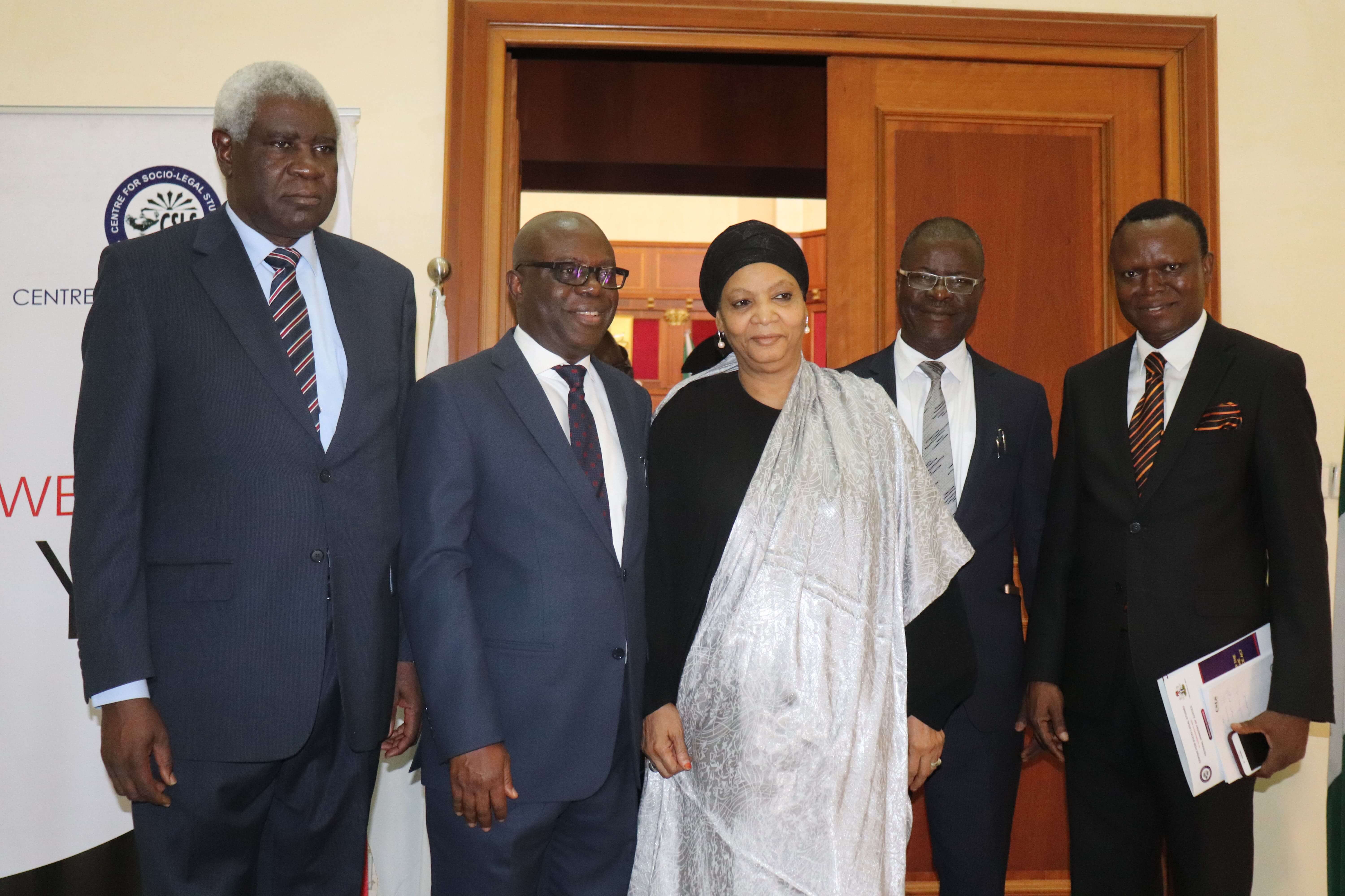 From R-L:Prof Yemi Akinseye George(President CSLS),Hon Justice Anselm A. Nwaigwe(CJ Ebonyi State) ,Hon Justice Zainab A. Bukachuwa(Former President Court of Appeal),Dayo Akpata (SGF),Hon Justice Abdu Aboki(Justice Supreme Court) at the 2-day National Minimum Standards Workshop held on the 9th and 10th of December, 2019